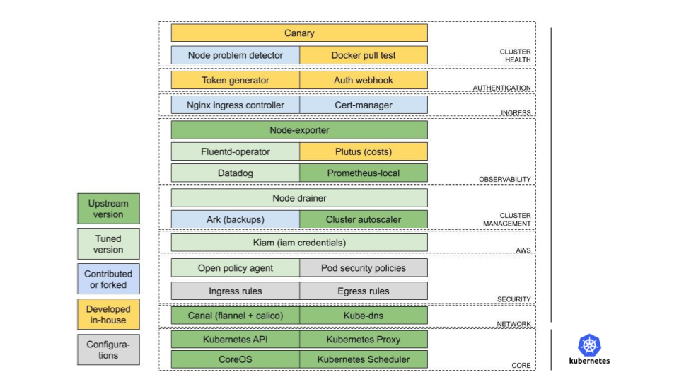 Below is a simplified comparison of what a raw installation of Kubernetes provides, and what our clusters provide. A bare Kubernetes cluster works, you can schedule containers, but that’s pretty much it. GKE, EKS, etc. provide slightly more than the left picture: they may autoscale nodes and handle other basic ops burden. But they are still far from covering the typical needs of product teams that wish to run production workloads securely, with little to no operational burden.