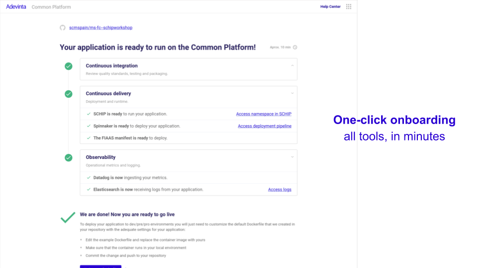 All this is (possibly) quite cool, but if engineers need weeks or months to start using it, nobody will. That was one of our top challenges a year ago. The core components in the PaaS were mostly there, but each team would have to spend days or weeks configuring each of them by hand on their repositories. Throughout the last year we’ve invested heavily in streamlining the onboarding process. We turned what was an Ikea-like experience into an almost seamless process. Users get a web interface, enter their repository URL, click on a button, and our automation takes it from there. It takes ~10 minutes for their repository to be automatically configured with CI/CD pipelines, deploying to their team’s private namespace, and integrated with metrics and logging systems. If something fails or manual action is required from our Platform teams, the onboarding tool notifies, keeps track of the issue in JIRA, and resumes the process when we’ve unblocked it.