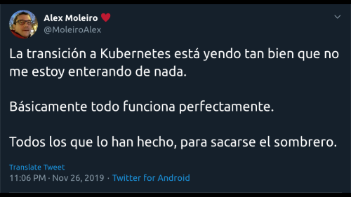 Translation: "The transition to Kubernetes is going so well that I'm not feeling it. Basically everything works perfectly. Hat tip to everyone who made it."